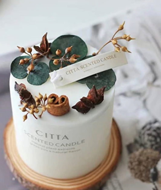 Cire de soja 100 % naturelle, décorations à base de fruits et de plantes séchées, socle en bois. Fragrance naturelle et authentique.